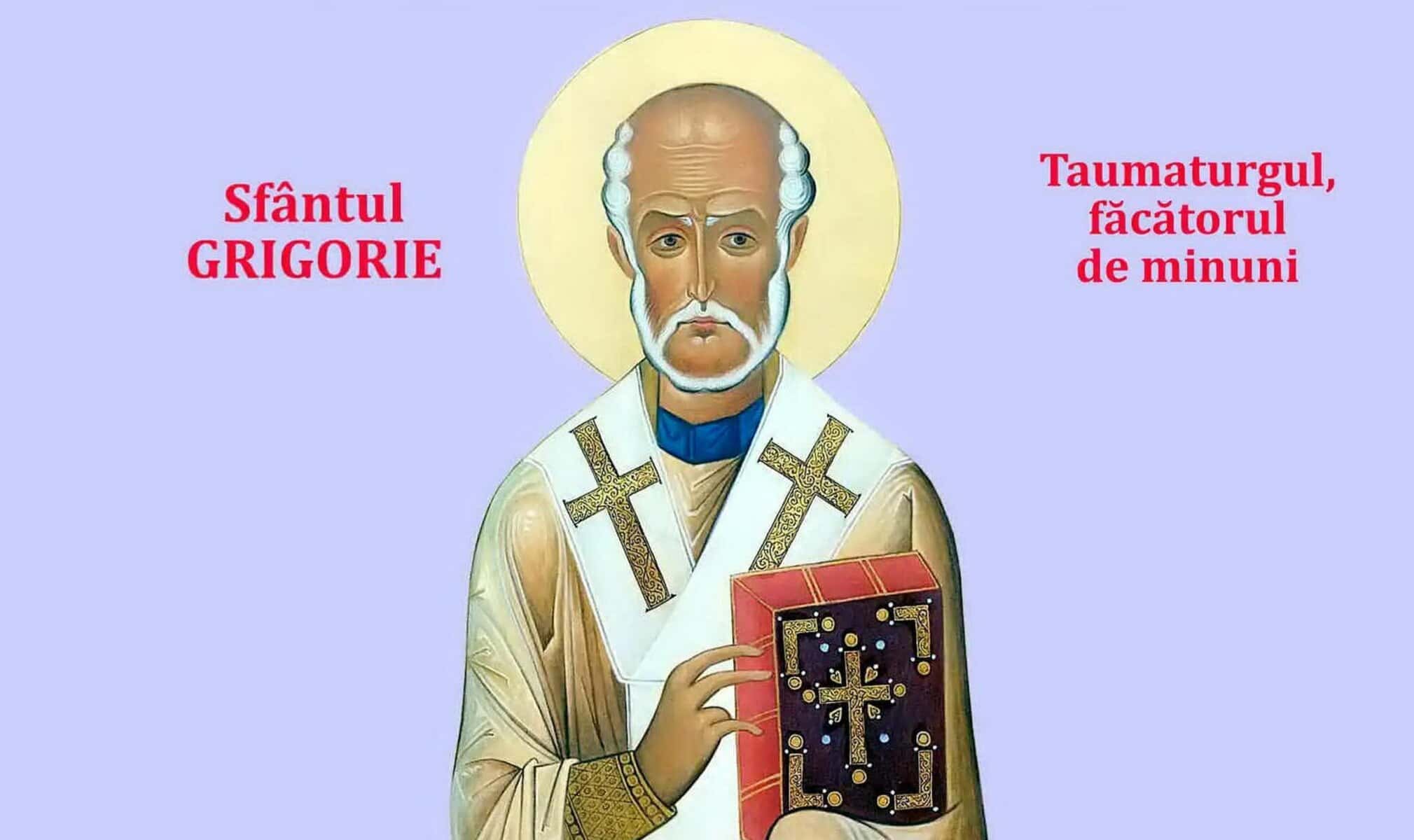 Acesta a trăit în zilele împăratului Aurelian (214-275) şi era din părinţi elini şi de tânăr a ales partea cea bună, cunoscând adevărata credinţă în Hristos. Crescând el în vârsta, creştea şi dreapta credinţă într-însul. Iar din pricina mărimii şi mulţimii minunilor ce făcea, a dobândit numele său, căci a fost chemat făcător de minuni. Aflându-se încă la scoală în Alexandria, după obicei învăţând filozofia, a venit la el o femeie desfrânată cu gândul ca apoi să-l clevetească, îndemnată fiind de alţi ucenici ce erau cu dânsul. Însă cuprinsă fiind de demon care o zbuciuma, sfântul a tămăduit-o cu rugăciunea sa. A văzut sfântul şi pe Preasfânta Născătoarea de Dumnezeu, împreună cu Ioan cuvântătorul de Dumnezeu, aievea învăţându-l taina Sfintei Treimi. Şi după ce a fost hirotonit episcop al Neocezareii de Fedim, episcopul Amasiei, şi după ce a mers la biserica ce i s-a dat, se spune că a făcut multe minuni, care nu s-au auzit, şi mai mari decât se pot crede. Că a pornit cu rugăciunea o piatră mare cât un munte şi a mutat-o în altă parte. Şi fiind sfântul călător s-a abătut de a intrat într-o capişte idolească, unde a gonit demonii de acolo şi după ce s-a dus sfântul, n-au mai cutezat să intre demonii acolo. Aceasta aflând cel ce purta grija capiştei, s-a mâniat pe sfântul. Iar sfântul a scris pe o hârtie: „Eu, Grigorie, poruncesc ţie, satano, intră”, şi punând-o în capişte, au intrat iarăşi demonii în ea. Iar mai-marele capiştei s-a îngrozit de această minune şi a devenit ucenic lui Hristos, apropiindu-se de marele Grigorie. Şi un lac mare, ce făcea valuri ca marea, l-a secat şi l-a făcut uscat, secând împreună şi vrajba pe care doi fraţi o aveau între dânşii, zicând fiecare că a fost lacul lui. Oprit-a şi calea unui râu, rugat fiind de locuitorii de acolo, înfigându-şi toiagul în udătura pământului cea repede, făcând atunci minuni peste minuni. Căci se vedea unde se întorcea apa înapoi, ca şi cum s-ar fi temut a se atinge de toiag, care toiag, uscat fiind şi lipsit fiind de firească umezeală, s-a făcut copac verde şi frumos, şi nici îndelungarea vremii n-a stricat minunea, ci şi acum, precum se spune, apa ocoleşte pe departe, iar copacul stând de atâţia ani propovăduieşte puterea lui Hristos arătată prin marele Grigorie. Afară de aceasta, pe un evreu, ce se prefăcea că este mort zăcând răsturnat, l-a făcut cu adevărat mort, precum el se prefăcea. Altădată iarăşi făcând rugăciune în munte, s-a arătat ca fiind copac celor ce căutau să-i facă rău. Deci, venind vremea trecerii către Domnul, a mulţumit lui Dumnezeu că, primind cetatea sa cu mulţi oameni şi fiind plină de necredincioşi şi păgânătate, a lăsat-o cu toţi aşezaţi în credinţă.