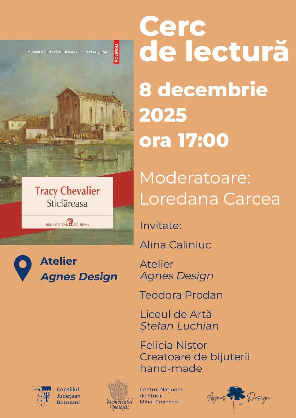 Întâlnirea va avea loc într-un cadru potrivit cu tema romanului, în atelierul unei creatoare de „bijuterii” (Atelierul „Agnes Design”). Invitatele, dna Alina Caliniuc (Atelierul „Agnes Design”), dna Felicia Nistor și Teodora Prodan (elevă la Liceul de Artă „Ștefan Luchian”), creatoare de bijuterii, vor prezenta tehnici de realizare a acestora, oferindu-le participanților prilejul de a descoperi o parte dintre „secretele” acestui delicat meșteșug. Cercul de lectură este organizat de Memorialul Ipotești – Centrul Național de Studii „Mihai Eminescu”.