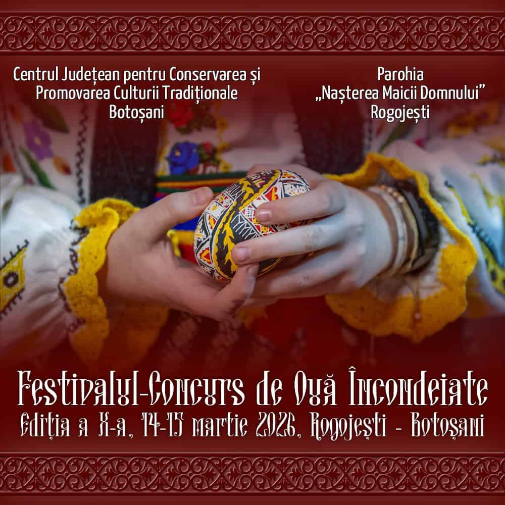 Centrul Judeţean pentru Conservarea şi Promovarea Culturii Tradiţionale Botoşani, instituție publică de cultură aflată în subordinea Consiliului Județean Botoșani, în colaborare cu Parohia „Nașterii Maicii Domnului” Rogojești, organizează Festivalul-Concurs de Ouă Încondeiate, ediţia a X-a, în perioada 14-15 martie 2026.