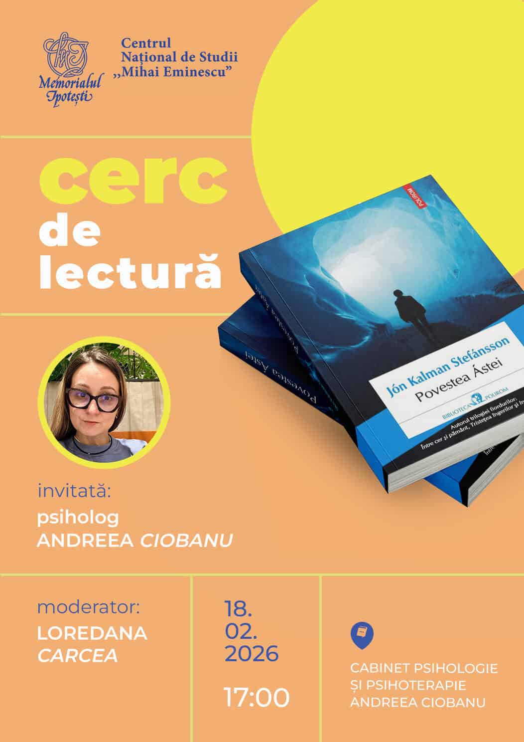 O nouă întâlnire a Cercului de lectură (adulți) va avea loc miercuri, 18 februarie 2026, începând cu ora 17.00, la Cabinetul de psihologie și psihoterapie Andreea Ciobanu, Botoșani. Pornind de la poveștile personajelor din romanul Povestea Astei, scris de Jόn Kalman Stefánsson (important scriitor contemporan islandez), participanții vor avea ocazia unui schimb de opinii privitoare la frumusețea vieții și la misterele existenței omului, raportând propriile păreri la modul în care reușește – în stilul său poetic inconfundabil – să le surprindă romancierul.