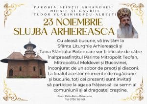„Cu aleasă bucurie, vă invităm la Sfânta Liturghie Arhierească şi Taina Sfântului Botez care vor fi oficiate de către Înaltpreasfinţitul Părinte Mitropolit Teofan, Mitropolitul Moldovei şi Bucovinei, înconjurat de un sobor de preoţi şi diaconi. La finalul acestor momente de rugăciune și bucurie, toți cei prezenţi sunt invitaţi să participe la agapa frăţească, ca semn al comuniunii şi al dragostei creştine”, a transmis pr. Felix-Petru Prisecariu, parohul comunității din Tudor Vladimirescu.