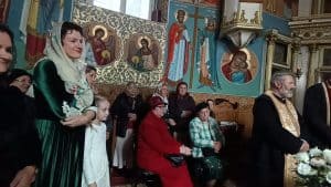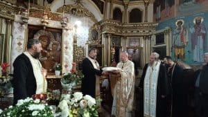 În numele parohiei v-am pregătit un dar care să vă fie de folos în slujirea de acum cât mai mult timp, pe care să-l înmulțiți în această parohie. Să dea Dumnezeu ca să vă ajute cât mai mulți ani de aici încolo darul acesta și să-l înmulțiți. Este vorba de acest set de veșminte pe care vi-l dăruim cu toată dragostea din partea parohiei. Vom sluji împreună aici și să îl aveți aici să așa cu drag cu dragoste și să dea bunul Dumnezeu ca întotdeauna când peste ani se va citi această filă a istoriei de astăzi să fie scris acolo cuvintele frumoase și să ajute bunul Dumnezeu ca în lista aceea de mulți preoți care au slujit la această parie și număram doar în pomelnicul parohiei vreo 42 de preoți de Mir, în afară de monahi, slujitori care au trecut pe aici și au slujit.