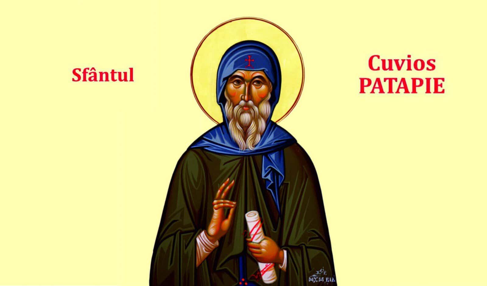 Sfântul Patapie s-a născut în anul 380 în orașul Teba din Egipt. Tatăl lui era guvernatorul regiunii și urmașul unei binecunoscute familii egiptene. El și soția lui erau creștini evlavioși și l-au îndrumat pe fiul lor în citirea Scripturii. Când Patapie a ajuns la vârsta potrivită, părintii lui i-au adus profesori reputați din Alexandria, capitala Egiptului, pentru a-l instrui în domeniul științelor, matematicii, filosofiei și retoricii. Datorită educației sale, a înțeles repede cât de trecătoare era viața din lumea aceasta și s-a simțit atras de viața ascetică. În acest sens a fost inspirat mai ales de Clement, Atanasie și Origen. Tatăl său l-a dus și la Școala catehetică din Alexandria, unde a fost profund influențat de un profesor orb, pe nume Didim. Didim l-a inspirat și mai mult în dorința lui de a urma calea ascezei. Când și-a terminat studiile, Patapie s-a întors la Teba, unde a aflat că tatăl lui murise. Dorindu-și să urmeze o viață aspră a monahilor, a plecat atunci în pustia egipteană, unde a devenit binecunoscut pentru nevoințele lui. Pentru că faima lui se răspândise, iar el nu mai avea pace în pustie, a plecat la Constantinopol în anul 428. În timpul călătoriei, l-a întâlnit pe ucenicul său, Șenuta, care pe vremea aceea era vâslaș. S-au oprit la Corint, unde au rămas vreme de șapte ani la un schit. În anul 435, Patapie a plecat de la schitul său din munți, continuându-și drumul spre Constantinopol. L-a luat cu el pe de-acum monahul Șenuta. Când au ajuns la Constantinopol, cei doi s-au dus, fără să spună cine erau, la Mănăstirea Maicii Domnului din Vlaherne, unde au primit o chilie din cele construite chiar în zidul de apărare a orașului. Rămânând necunoscuți celorlalți, Patapie și ucenicul său și-au reluat nevoințele, petrecându-și vremea în posturi aspre, privegheri și rugăciuni, ca niște monahi de rând. A devenit făcător de minuni, vindecând pe mulți de bolile lor. A trecut la Domnul în anul 463, la vârsta de 83 de ani și a fost înmormântat de ucenicii săi în Biserica Sf. Ioan Botezătorul din Petra, Constantinopol, biserică ce s-a aflat mai târziu sub protecția familiei imperiale a Paleologilor, și mai ales a Sfintei Ipomoni, mama ultimului împărat al Bizanțului, Constantin Paleologul. După adormirea Sfântului, Biserica a strâns și păstrat cu grijă istoria vieții și a sfintelor sale moaște. La o mie de ani după adormirea Sfântului, când Constantinopolul a fost cucerit de turci, moaștele sfântului au fost luate din biserică și duse la micul schit săpat în stâncă din Corint, după cum sfântul o și ceruse când era încă în viață. Trupul sfântului a fost ascuns în spatele peretelui de apus al peșterii, înaintea iconostasului și a capelei construite acolo. La începutul secolului al XX-lea, un preot din zonă, Pr. Constantin Sosanis, a descoperit moaștele sfântului ascunse în perete. Pr. Constantin, care slujea de obicei în această capelă, era un om neobișnuit de înalt, și din această pricină a hotărât să facă unele modificări ale capelei. Cu o seară înainte să înceapă lucrările la zidul de apus, Pr. Constantin a visat că a venit la el un monah care l-a prevenit: „Fii atent când o să spargi peretele, căci eu mă aflu de cealaltă parte. Sunt Sfântul Patapie Egipteanul. A doua zi, trupul sfântului a fost descoperit: ținea la piept o cruce mare de lemn, un sul de pergament pe care era scris numele său, iar moaștele erau acoperite cu niște frunze mari, încă verzi, de parcă atunci ar fi fost culese. După descoperirea moaștelor sale, Sfântul s-a arătat mai multor oameni în vis sau în vedenie, cerându-le să-l viziteze la „casa lui din Loutraki”. Este cunoscut mai ales ca vindecător de cancer, săvârșind minuni în întreaga lume.