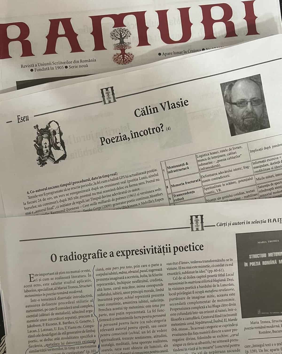 Tot în Ramuri” nr. 12 din 2025, Călin Vlasie continua serialul său „Poezia, încotro?” Rețin din capitolul ”Experimentalism în poezia viitoare”: „Există o mică schimbare de sens astăzi față de ce a însemnat experimentalismul în poezia secolului XX. 1) „Experimentalismul classic (modernism – postmodernism) era asociat cu ruptura de tradiție: formală (vers liber, colaj, limbaj brut), tematică (antiliric, urban, politizat) sau tehnologică (poezie vizuală, concretă, digitală în fază incipientă). Regândirea ideii de poezie. Exemple: Tristan Tzara, Gellu Naum, lettrismul, optzeciștii „fracturali” din anii 2000.