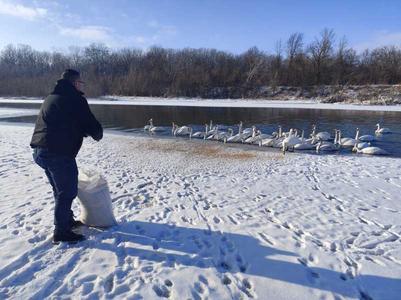 Botoșani: Zeci de lebede care iernează pe malul Prutului, hrănite de localnici cu boabe de porumb