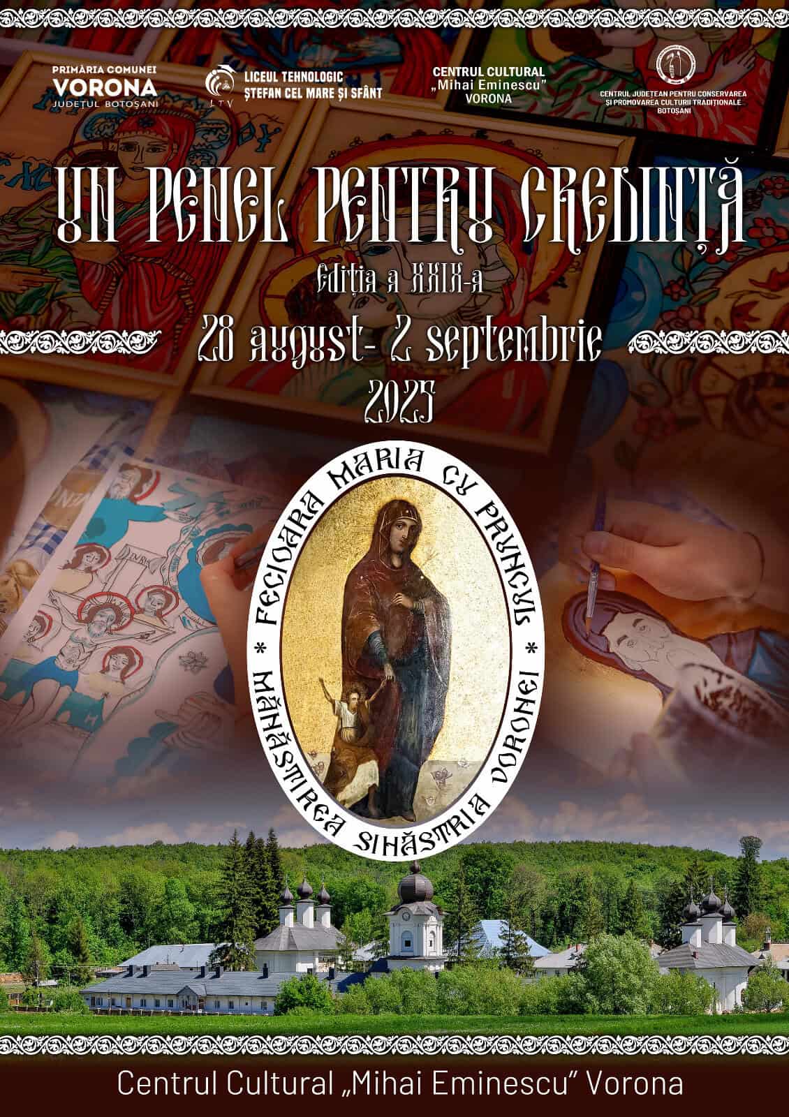Centrul Județean pentru Conservarea și Promovarea Culturii Tradiționale Botoșani, instituție publică de cultură aflată în subordinea Consiliului Județean Botoșani, în parteneriat cu Primăria Comunei Vorona, organizează, în perioada 28 august – 2 septembrie 2025, la Centrul Cultural „Mihai Eminescu” Vorona, Tabăra de pictură religioasă „Un penel pentru credință” ediția a XXIX-a.