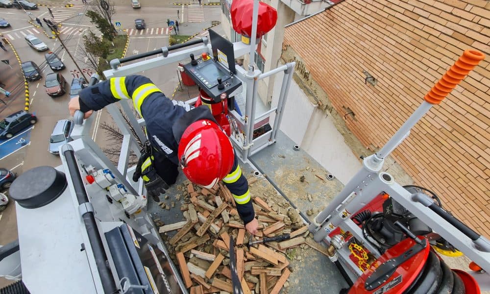 FOTO: Mai multe cărămizi de pe fațada unui bloc din municipiul Botoșani, în pericol să se desprindă, îndepărtate de pompieri