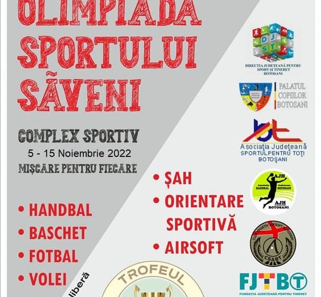 Olimpiada Sporturilor va fi organizată în orașul Săveni în perioada 05-15 noiembrie 2022 și are ca scop promovarea valenţelor cultural-educative ale sportului şi educaţiei fizice, a...
