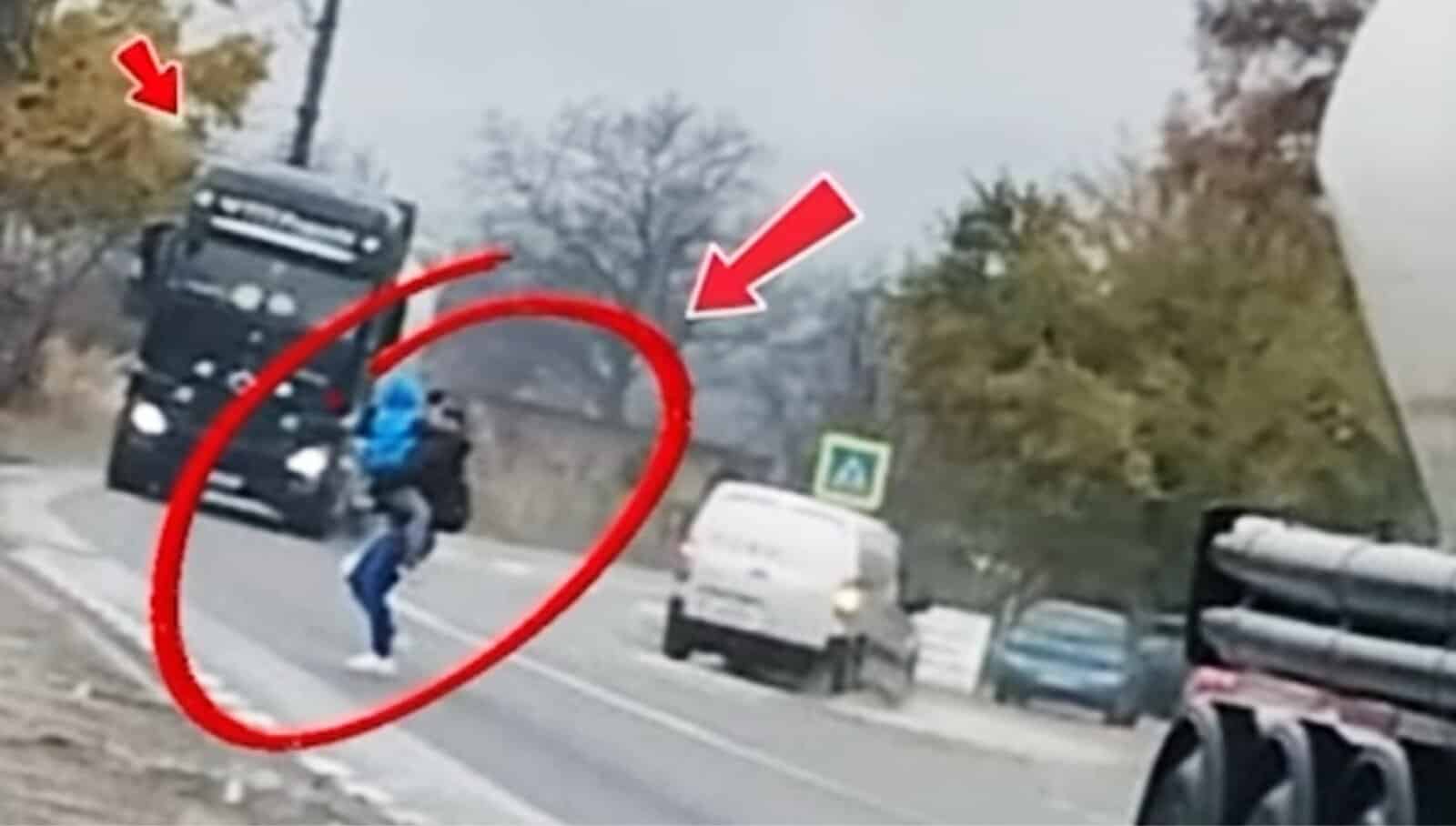 O mamă cu copilul în brațe a fost surprinsă în timp ce traversa grăbită strada printre două TIR-uri, la doar câțiva pași de o trecere pentru pietoni