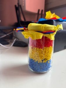 Am început prin vopsirea orezului în culorile tricolorului, l-am lăsat apoi la uscat, după care am pregătit materialele individual pentru fiecare copil. Am continuat cu aranjarea orezului în borcane, strat cu strat, în culorile drapelului. Ulterior, am așezat capacele, am decupat hârtia creponată pentru decor, am legat borcanele cu fire de lână și, la final, le-am etichetat cu prenumele copiilor.