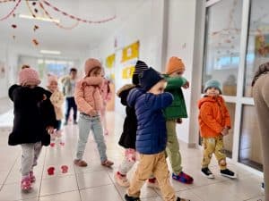 Însoțiți de cadrele didactice, copiii au ieșit din sălile de clasă în momentul în care au auzit alarma și s-au îndreptat spre locul de adunare.
