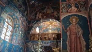 Pictura murală din interior executată în tehnica fresco aparțin domnului Dan Gogu din București, pictor bisericesc de categoria I.