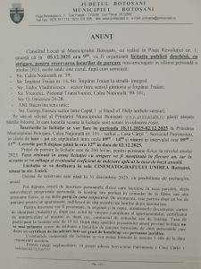 Consiliul Local al Municipiului Botoşani, cu sediul în Piaţa Revoluţiei nr. 1. anunţă că în data de 05.12.2025 ora 09:00, va organiza licitaţia publică deschisă, cu strigare, pentru rezervarea locurilor de parcare nou-amenajate în ultima perioadă a anului 2025, acolo unde este cazul, după cum urmează: